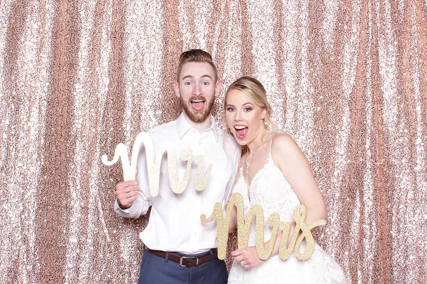 A photo booth at the Dresser Mansion in Tulsa, OK is always so much fun. One of the best spots to put a photo booth for a wedding is in the library. The mansion is such a gorgeous and unique venue and putting the photo booth downstairs encourages guests to explore the Mansion a bit more. It’s a venue that definitely needs to be shown off properly. It also helps spread the guests out a bit. It worked perfectly for Mike and Reece’s Tulsa wedding at the Dresser Mansion. We setup a Pink Champagne backdrop and designed a matching Rose gold template.