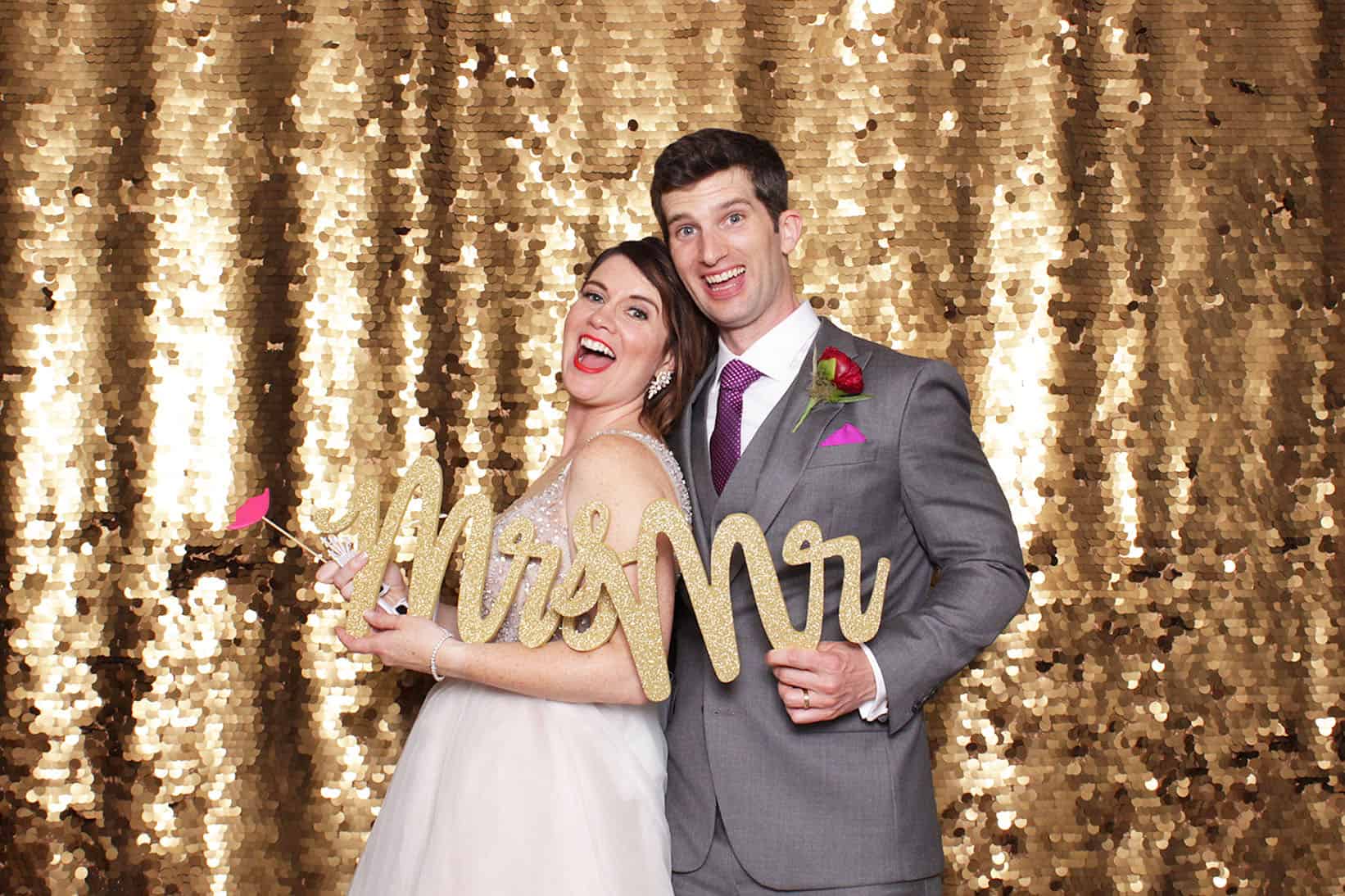 This was such a fun day! Truthfully though, all of our days are pretty epic. However, it’s definitely noteworthy when we get to be a part of a classy affair like this elegant wedding at The Mayo Hotel in Tulsa, OK. We set up their Tulsa photo booth rental in the cocktail area. There’s no bad time for a photo booth but having one setup during cocktail hour is a great additional activity for guests. We were just outside the Crystal Ballroom but we could see through the doors all the amazing decor for their wedding reception. It was gorgeous! We may be a crazy fun photo booth but we can do classy! We used our Luxe gold backdrop with extra large sequins and kept the prints chic with a black and white minimalist design. The best thing about these two is that they know when to let loose and party hard with the rest of ’em! Thank you for letting us be a part of your big day!