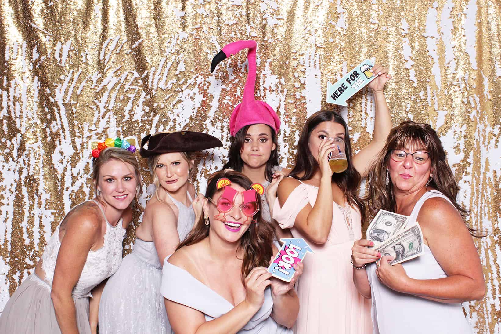 When you book a photo booth rental from us for a wedding, it will have the ability to take high-quality photos and print within seconds. It includes a props table with plenty of fun props. The set up is always sleek, clean, and comes with one of our sequin backdrops. There will also be two engaging attendants to encourage your guests to participate and make sure everything runs smoothly. We guarantee your guests will have a great time! They will be amazed by the capability to instantly download their photos to their phones and share them to social media or just keep them to cherish forever. We make sure to bring everything needed and all you have to do is provide a space and a bunch of people. Check out our photo booth rental in action at Brad and Kacey’s FUNtastic wedding {yes, I totally just did that} at Sparrow Beginnings in Stillwater, OK!