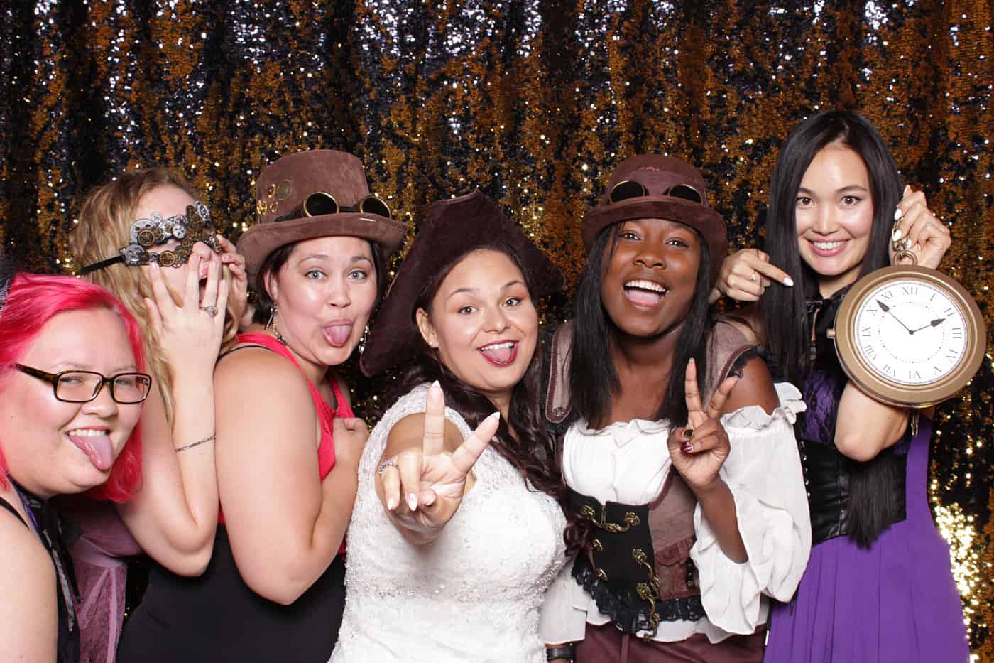 Stephen and Loran are a fun and imaginative duo and for their wedding they wanted something unique. They wanted a wedding that was truly “them” and for their guests to feel like they were in a totally different world. Steampunk itself is a beautiful marriage of industrial technology and Victorian fashion with a futurist flare. Their wedding at The Springs Event Venue in Edmond, OK was laid back and felt like a big reunion. Copper is a huge part in steampunk design so we used our Black & Gold Mermaid backdrop to create a similar effect. We designed a steam punk photo booth template with DaVinci and Sherlock Holmes inspired elements. And we brought all the top hats, goggles, and steampunk-ish trinkets we could find. Thank you Stephen and Loran for giving us such a fun theme to work with. You two are awesome and your wedding will forever be remembered.