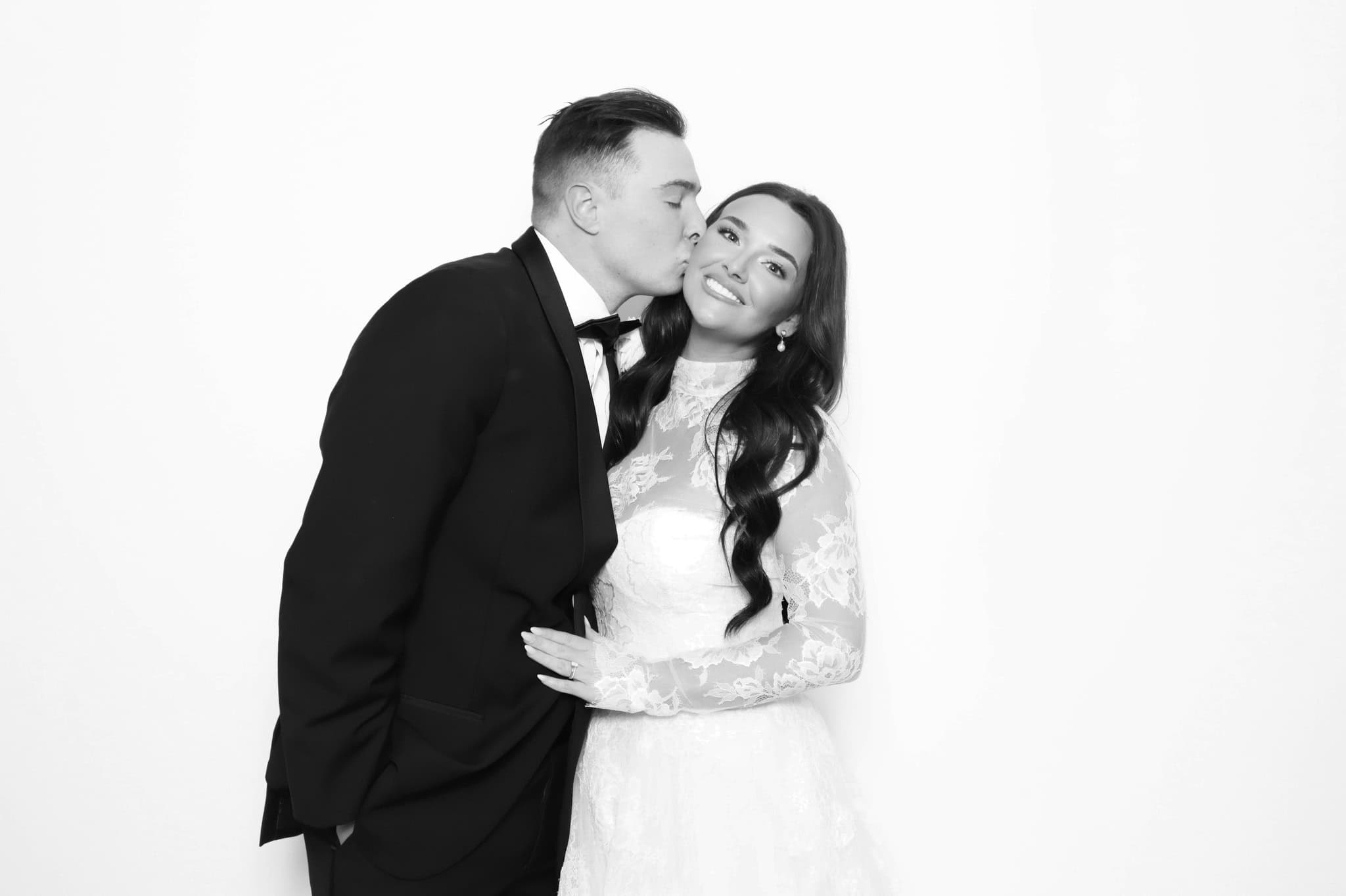 Isaiah and Darbi’s Tulsa wedding at The Mayo Hotel was the perfect mix of timeless and modern and our photo booth fit right in. Guests lined up all night to snap chic black and white portraits that felt straight out of a fashion magazine. Each print was a single, postcard-sized keepsake stamped with the couple’s elegant monogram. It was a stylish nod to classic romance with a modern twist. We happened to be situated admist cocktail hour and later the dinner buffet. From cocktails to guests with plates in hand (or head lol) ready to dine and celebrate, this booth caught it all, giving everyone a little piece of the night to take home.
